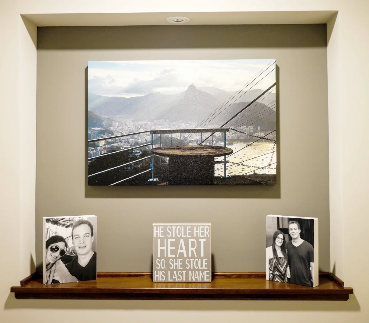 With grays running through our home we continued the theme in our master with a dark gray accent wall as well as a dark gray strip around our tray ceiling. The chandelier artwork played off of the grays while bringing in a bright pop of gold so it quickly became the focal point of the room. With such a bold statement piece we wanted to keep the rest of the decor simple and understated. Running golds and grays through our accent pillows ties walls to the bed and adds a variety of textures. Tripod lamps, books and personalized photos finish out the design finding a balanced look without seeking perfect symmetry.