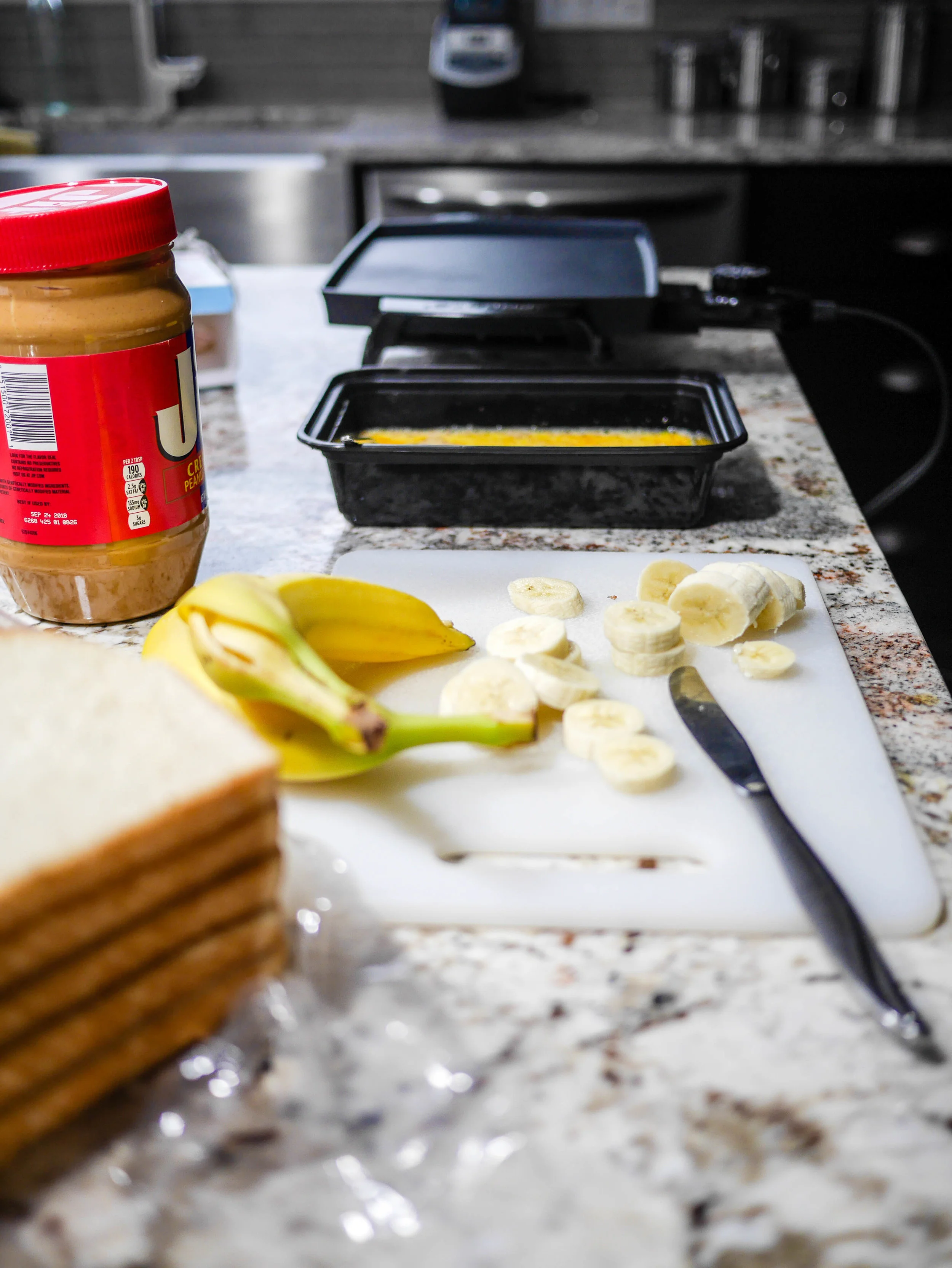 Have your bread out, peanut-butter and bananas ready, and egg bath whisked. You can use the same combination of eggs, milk (or evaporated milk), cinnamon and nutmeg that we used in our classic french toast last week.